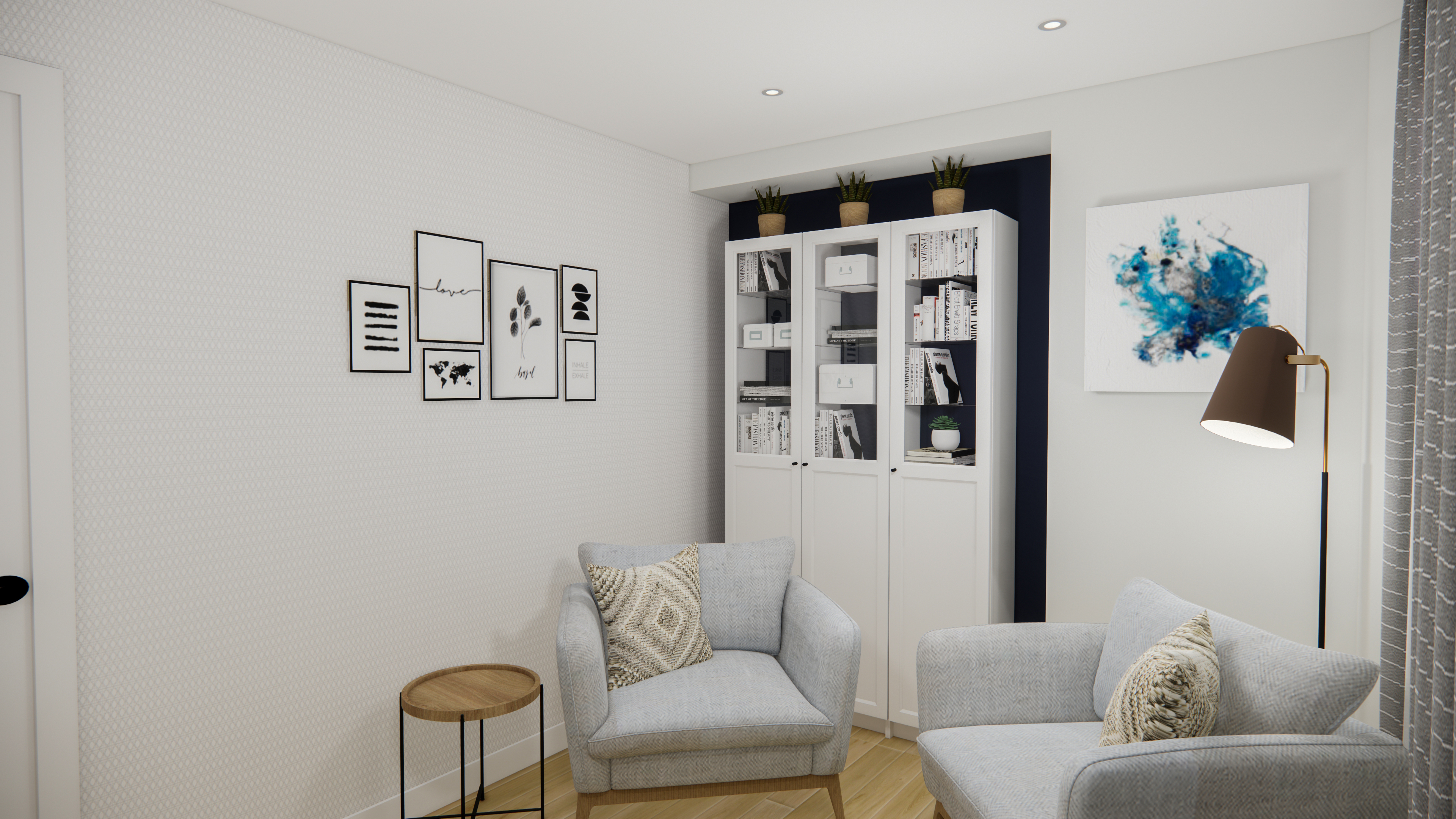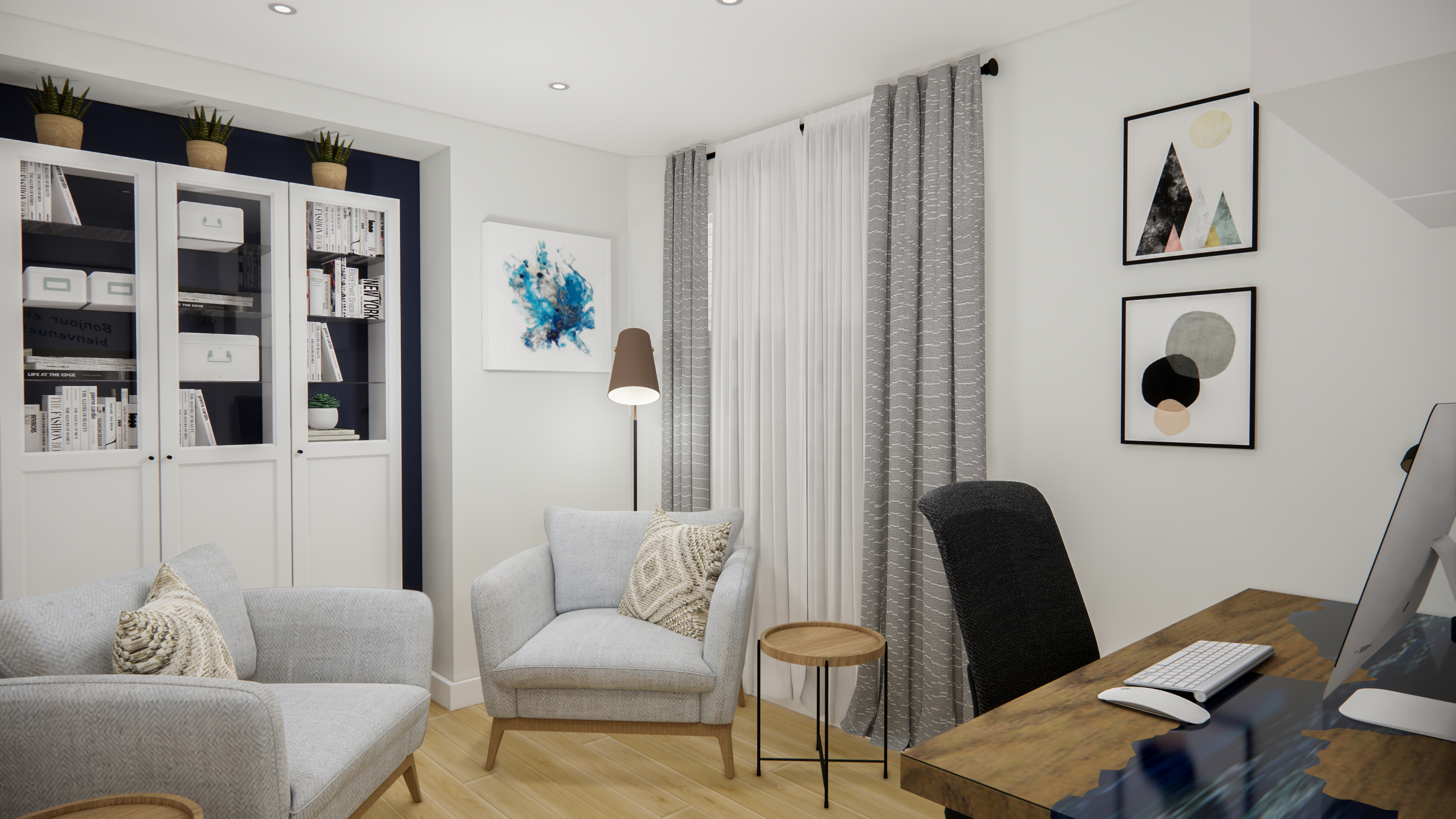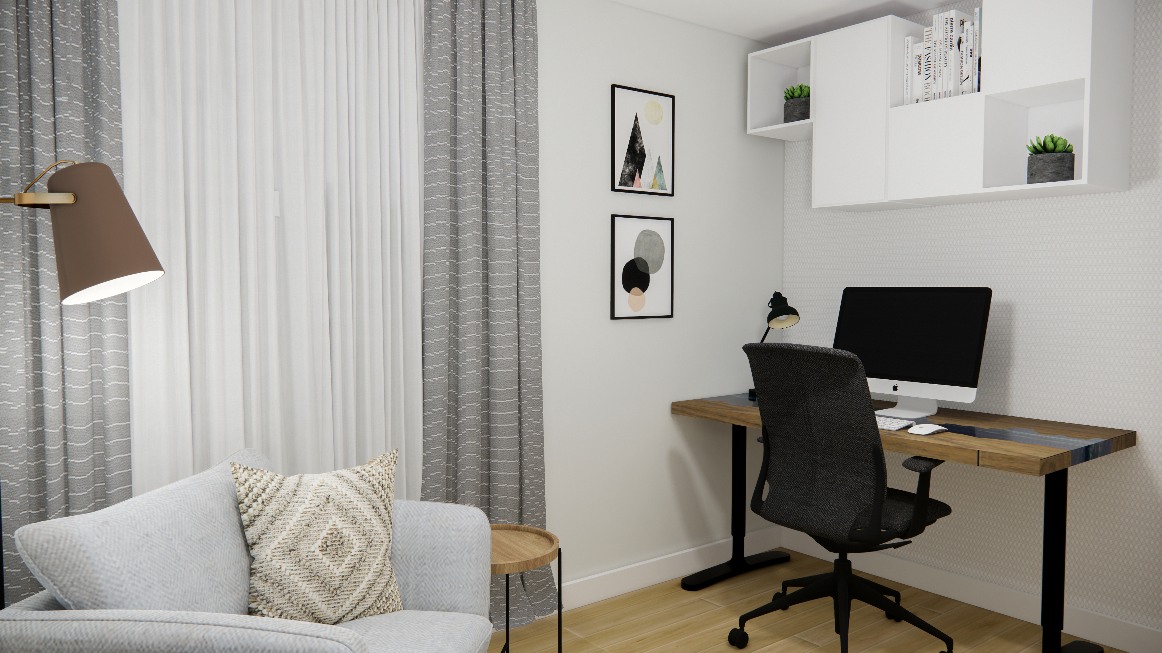Le concept devait donc intégrer une zone de travail avec un bureau de type assis-debout, un coin fauteuils pour les rencontres ainsi que de maximiser le rangement autant que possible.